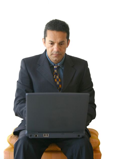 business man working on a laptop sitting on a stool