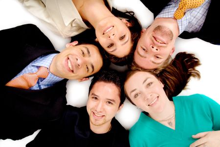 business office team work - all young and successful businessmen and businesswomen with heads together