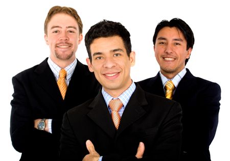 Business office teamwork where there are only men - all smiling - isolated over a white background
