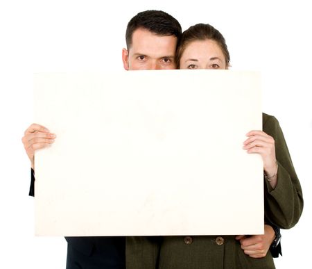 Business parners holding a white card board - isolated