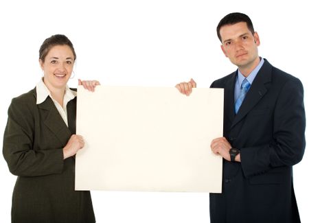 business partners holding a banner add isolated over a white background