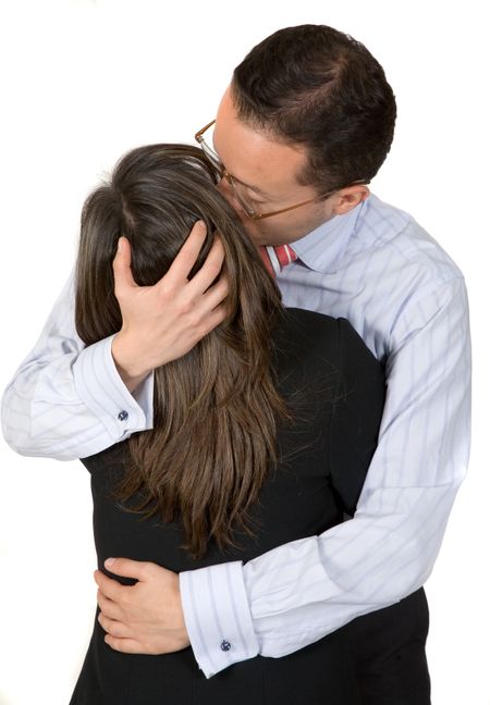 business partners kissing over a white background