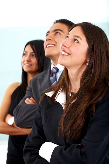 business people with high expectations in an office looking up