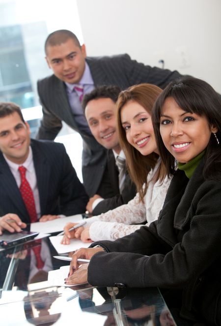 Business people at a staff meeting smiling