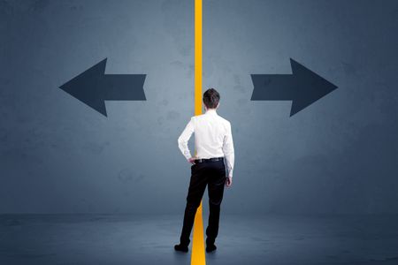 Business person choosing between two options separated by a yellow border arrow concept