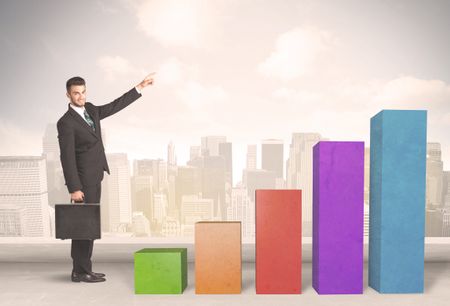 Business person climbing up on colourful chart pillars concept on city background