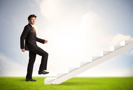 Business person climbing up on white staircase in nature background concept