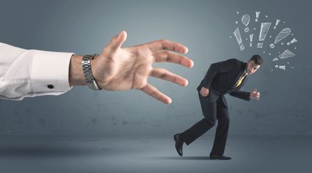 Business person with hand drawn exclamation marks getting away from a big hand concept on background