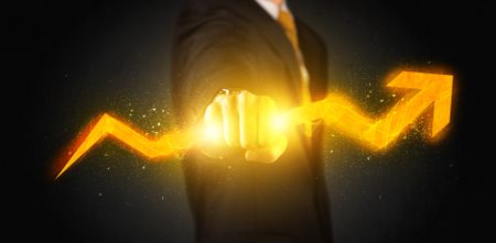 Business person holding a hot glowing upright arrow concept on background