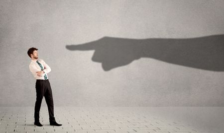Business person looking at huge shadow hand pointing at him concept on background