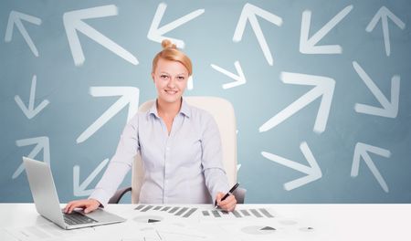 Business person sitting at desk with different direction concept