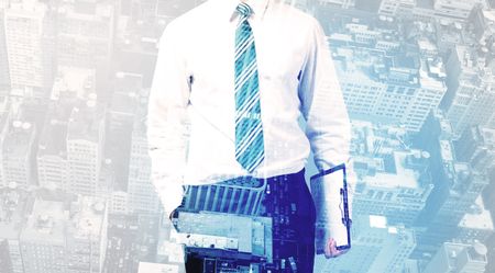Business person standing with blue cityscape in the background
