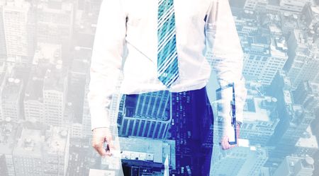 Business person standing with blue cityscape in the background