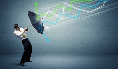 Business person with umbrella and colorful stock market arrows concept