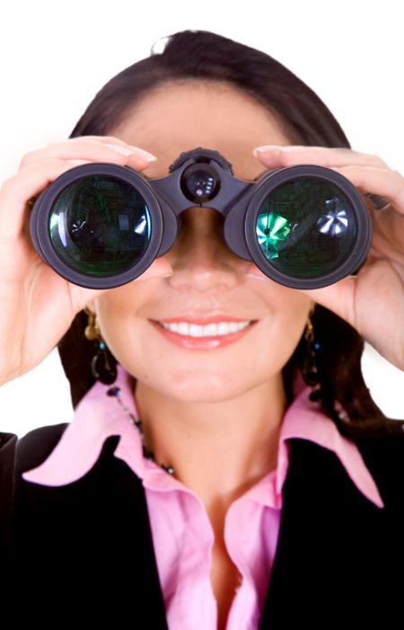 Business search - woman with binoculars isolated over a white background