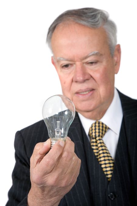 business senior with a lightbulb thinking of ideas for his business over a white background