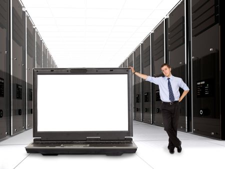 business servers made in 3d with their manager and a laptop in front - space on the laptop screen for you to put your message