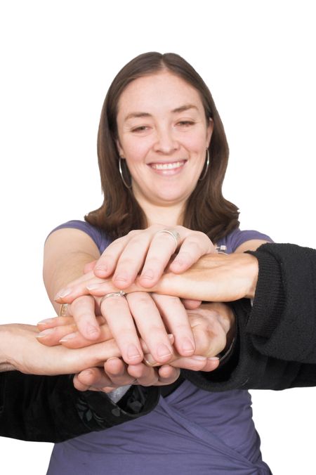 business team with their hands together - face of one of the women
