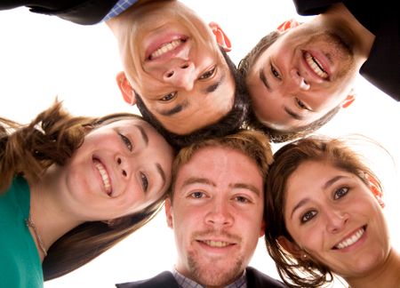 business team with their heads together over a white background