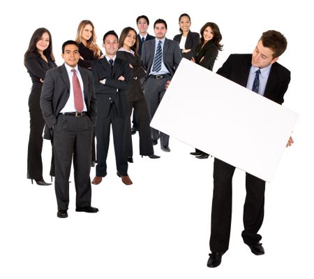 Business team holding a banner ad isolated on white