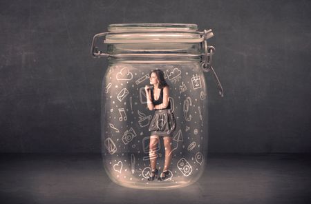 Business woman captured in glass jar with hand drawn media icons concept on background