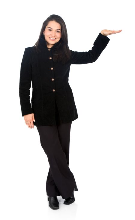 business woman displaying something under her arm isolated over a white background