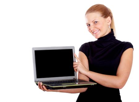 Business woman displaying a laptop computer - isolated over a white background