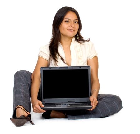 business woman displaying a laptop isolated over a white background