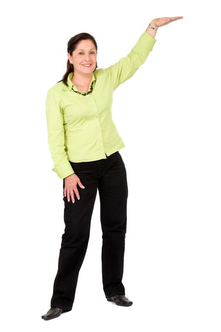 business woman displaying your product - over a white background