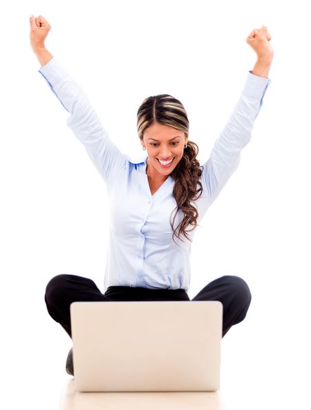 Business woman enjoying her online success - isolated over white
