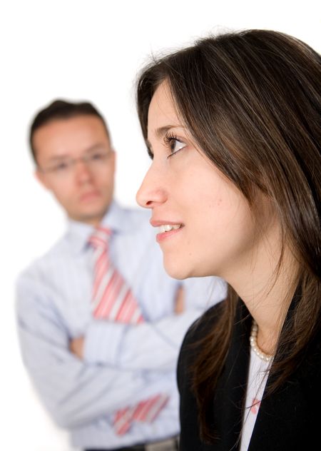 business woman with full of expectations looking away with her business partner looking at her over a white background - focus is on the girl