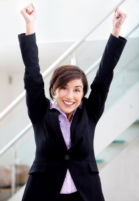 business woman full of success with her arms up at the office