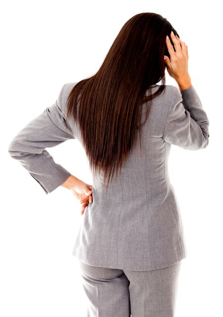 Business woman having problems scratching her head - isolated over white