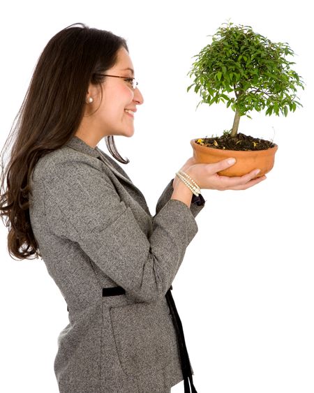 business woman holding a bonsai tree isolated over a white background