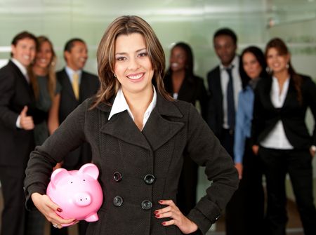 business woman holding a piggy bank at her office - business concepts