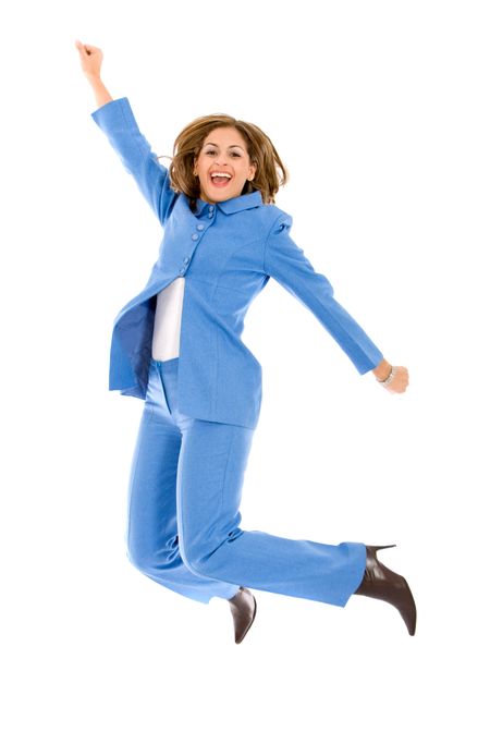 business woman jumping of success looking happy - isolated
