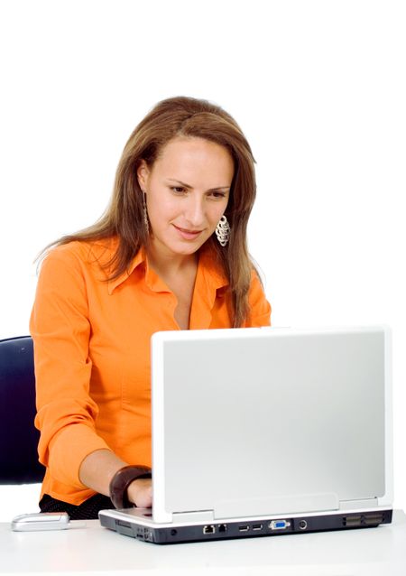 Business woman on a laptop computer in her desk isolated over a white background
