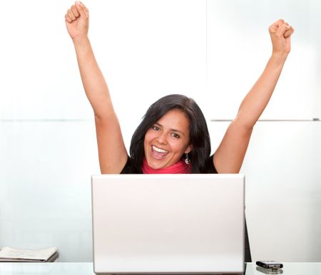 business woman on a laptop full of success with her arms up