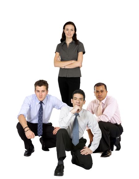 business woman leading a team of men isolated