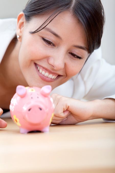 Business woman looking at a a piggybank and smiling
