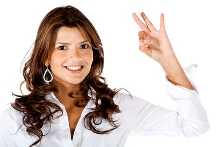 Business woman making an ok sign isolated over a white background