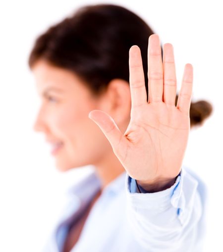 Business woman making Talk to the hand gesture - isolated over white