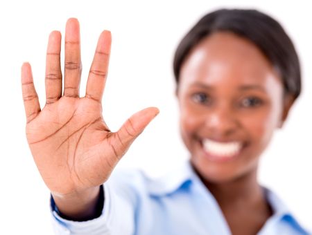 Business woman making talk to the hand gesture - isolated over white
