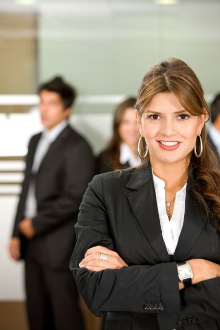business woman in an office environment with people working behind her