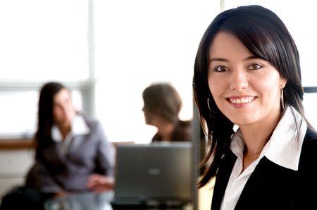 Business woman in an office with her team behind working on a laptop