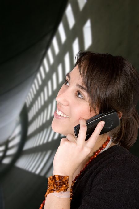 Business woman on the phone with an abstract wall in the background