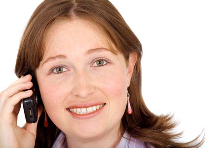 business woman on the phone smiling and isolated over a white background