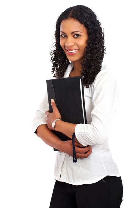 business woman portrait holding a folder - isolated over a white background