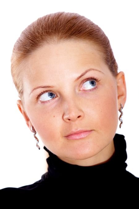 business woman portrait looking up to the corner of the image