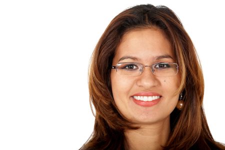 business woman portrait smiling wearing glasses isolated over a white background
